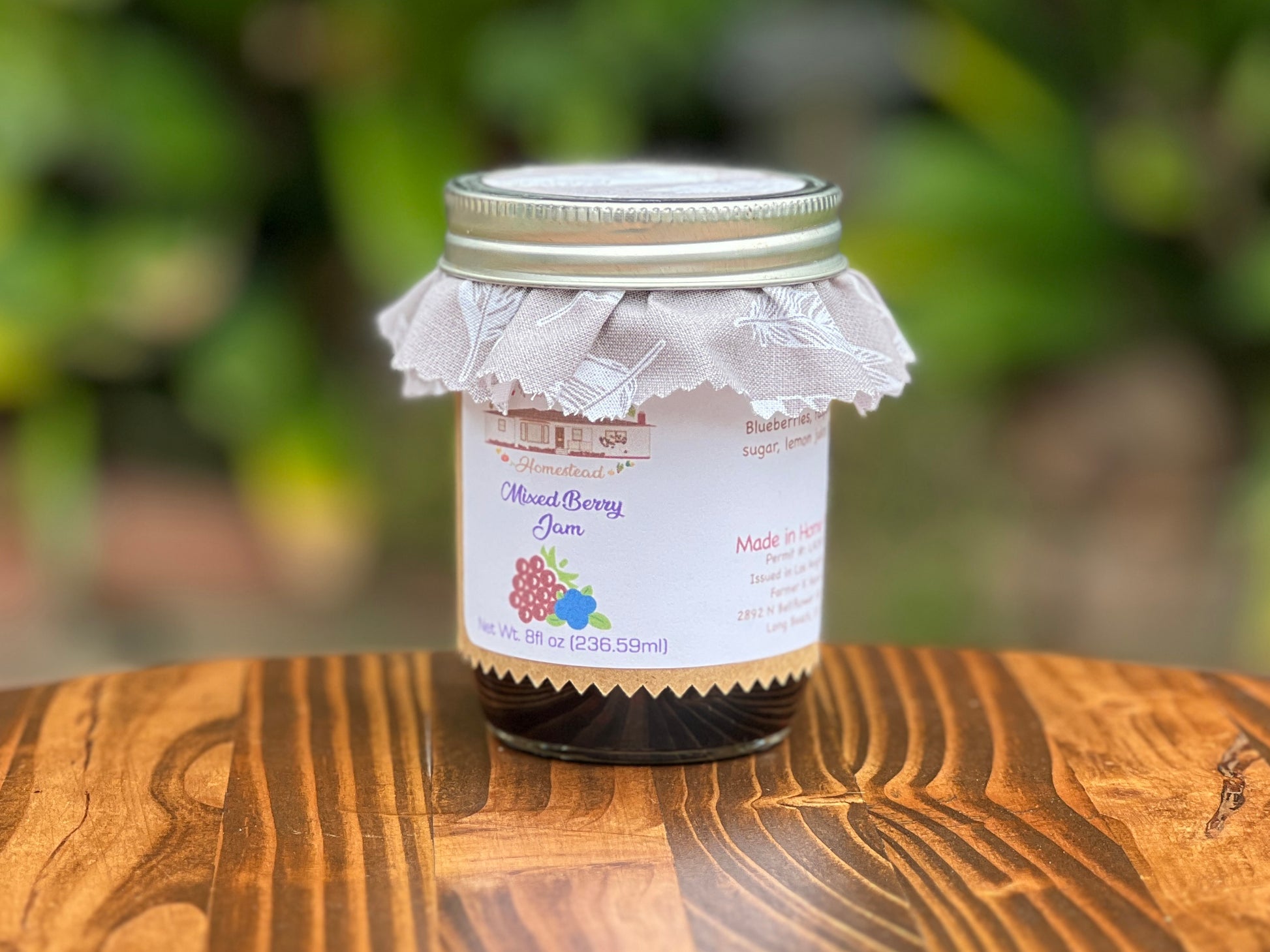 Savory and sweet, our Mixed Berry Jam is handmade with locally sourced berries for a delicious homemade taste. Made with tart raspberries, juicy blueberries, and a hint of sweetness, this 8oz jar contains no preservatives for a fresh, natural flavor. Enjoy the vibrant taste of summer with every bite.